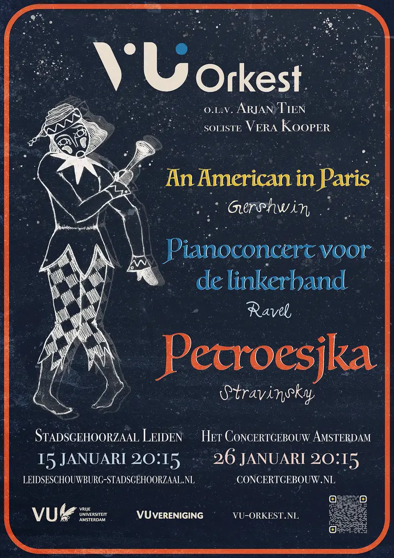 Het VU-Orkest speelt op 26 januari in het Concertgebouw, een bruisend programma spelen met bekende stukken uit de 20e eeuw, namelijk: An American in Paris van Gershwin, Pianoconcert voor de linkerhand van Ravel met soliste Vera Koper, en Petroesjka van Stravinsky.