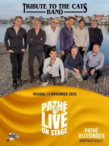 PATHÉ VLISSINGEN – LIVE ON STAGE In 2002 werd in Volendam een muzikaal eerbetoon gebracht aan The Cats, in de jaren ’60 de grondleggers van wat later als de ‘palingsound’ werd aangeduid. Het bleef niet bij dit eenmalige optreden, want de wijze waarop de “Tribute To The Cats Band “ (de enige echte uit Volendam) de hits van hun legendarische dorpsgenoten nieuw leven had ingeblazen vroeg om een vervolg. Inmiddels zijn we bijna 24 jaar en meer dan 850 concerten verder. ‘Lea’, ‘Why’, ‘Marian’, ‘Times were when’ en niet te vergeten de wereldhit ‘One way wind’ zorgen wekelijks in het land voor een feest der herkenning. De bezoekers van de concerten van de Tribute To The Cats Band zijn vroeger voor een deel ook de bezoekers van de concerten van The Cats geweest. Maar bij de grote schare fans die zich inmiddels rond de band heeft verzameld sluiten zich ook steeds meer jonge mensen aan omdat ze aan een avondje Catsmuziek veel gezelligheid en plezier beleven. De meeste bandleden hebben in het verleden hun sporen in de Volendamse muziekscene ruimschoots verdiend, in onder meer Next One, The Business, Dutch, Dos Chicos, en Fiësta: Thoom Veerman ( momenteel vervangen door Frank Keijzer), Nico Tol & nieuweling Gerry Trum ( hij zal Nico deels vervangen ), Marcel Veerman, (‘Oomzegger’ tegen The Cats lid, Cees Veerman & oud TTTCB lid Harmen Veerman), Michel de Haan, broer en nieuweling Peter de Haan (bekend van De Mon Amour Band en Always Wanted (Dutch Bon Jovi Tribute) en Jan Veerman.Cees Veerman en Larry Koning, zijn aanstormende talenten, die de tijd van The Cats nooit hebben meegemaakt. Des te meer waarderen ze wat hun dorpsgenoten indertijd teweeg hebben gebracht en genieten ze wekelijks van wat de muziek van The Cats anno 2026 nog steeds los maakt. De meerstemmige samenzang is een van de opvallende kenmerken van de Tribute To The Cats Band, waardoor ze in staat zijn die karakteristieke Cats sound weer ten gehore te brengen. Daarbij worden ze onder meer ondersteund door soundengineer & manager Jan Schilder (broer van The Cats lid Jaap Schilder) die destijds bij The Cats ook al verantwoordelijk was voor het zaalgeluid. Bij hem is ook ‘Vaya con dios’, ‘Scarlet ribbons’, ‘Marian’,’Lea’ en ‘Jukebox’ en nog velen andere hits, weer in vertrouwde handen.Misschien nog wel het meest trots op het succes en de populariteit van de Tribute To The Cats Band zijn de oorspronkelijke bandleden van The Cats zelf. Dat heeft onder meer al geleid tot enkele gastoptredens, waarbij zowel op het podium als in de zaal vele emoties loskwamen.Kortom: Tribute To The Cats Band staat met negen man sterk garant voor een sfeervol avondvullend programma met vrijwel alle Cats-hits: En nogmaals , het is een feest van herkenning met veel gezelligheid en plezier!